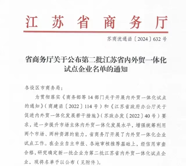 此次試點企業(yè)的評選,是江蘇省積極響應國家商務(wù)部等14部門聯(lián)合發(fā)布的《關(guān)于開展內(nèi)外貿(mào)一體化試點的通知》(商建函〔2022〕114號),并結(jié)合《江蘇省政府辦公廳關(guān)于促進內(nèi)外貿(mào)一體化發(fā)展若干措施》(蘇政辦發(fā)〔2022〕40號)文件精神,旨在通過構(gòu)建高效聯(lián)通的內(nèi)外貿(mào)體制機制,打通內(nèi)外貿(mào)堵點,促進國內(nèi)國際雙循環(huán)相互促進的新發(fā)展格局。