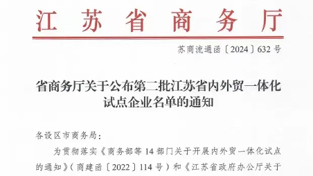 近日,省商務(wù)廳公布了“第二批江蘇省內(nèi)外貿(mào)一體化試點(diǎn)企業(yè)名···