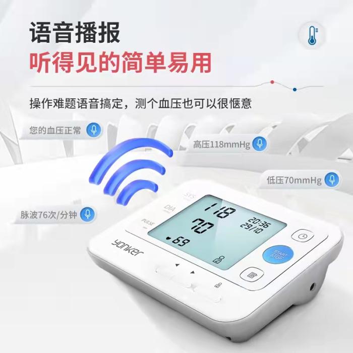 永康醫(yī)療的臂式血壓計無需復雜設(shè)置,測血壓只需一步。為了減少父母測血壓時操作設(shè)備的不便,我們將產(chǎn)品設(shè)計成大屏大字體顯示,健康數(shù)據(jù)一目了然。有的產(chǎn)品還有語音播報血壓數(shù)據(jù)的功能,測量血壓過高時還會發(fā)出警報,對于中老年使用者非常友好。